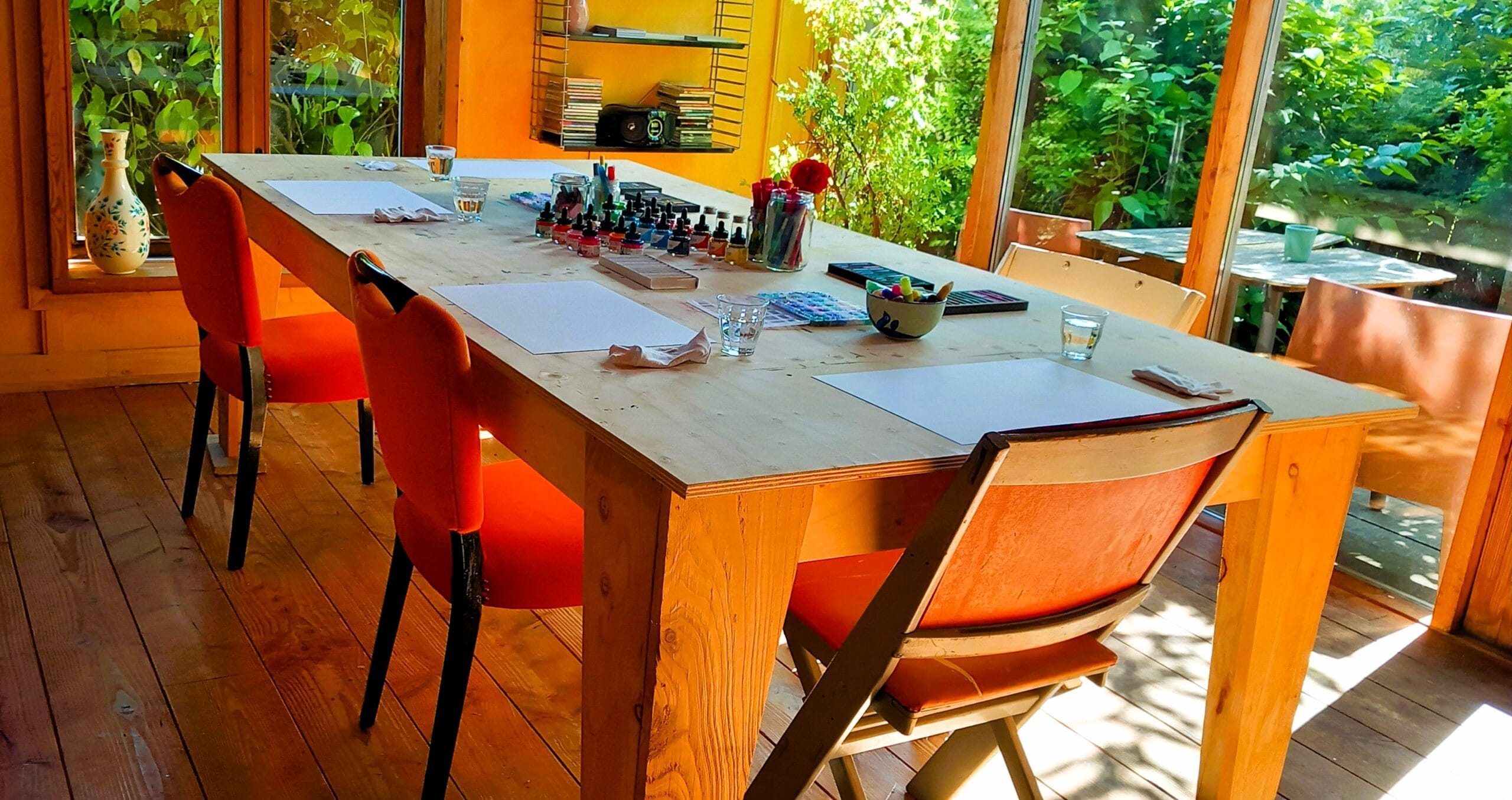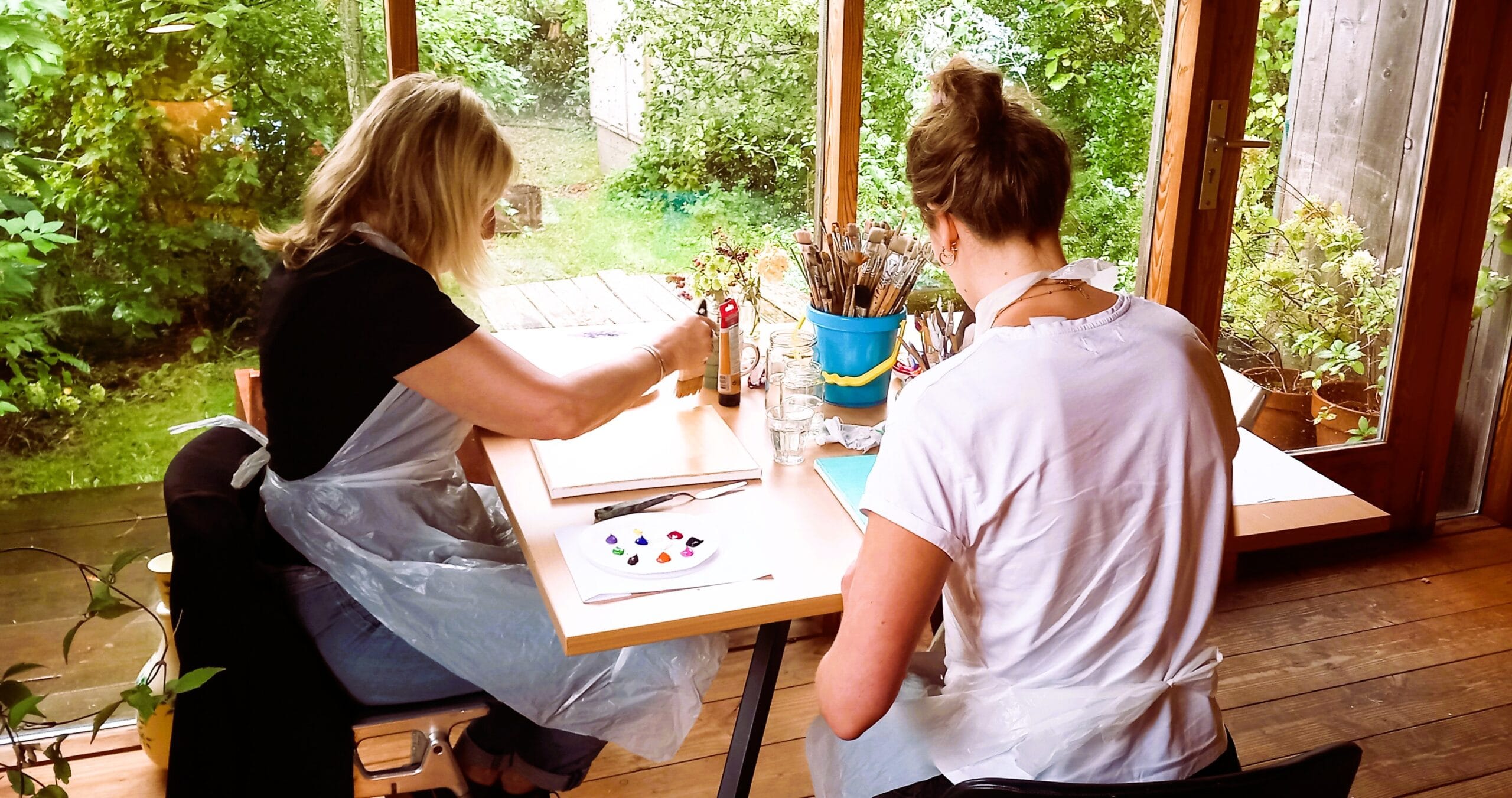 Alle workshops vinden plaats in mijn lichte atelier in Schoorl. Je volgt de workshop in een veilig groepje. Alle workshops zijn namelijk voor jou alleen en eventueel voor de mensen die je meebrengt (er zijn dus geen andere deelnemers bij). Ik zorg voor alle materialen – van verf en doeken tot verschillende soorten papier, krijt en potloden, koffie (cappuchino;)/thee en wat lekkers. Je bent van harte welkom voor een paar uur creatieve flow!